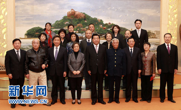 12月16日,纪念汪锋同志诞辰100周年座谈会在北京人民大会堂举行,中共中央政治局常委、全国政协主席贾庆林出席座谈会。中共中央政治局委员、全国政协副主席王刚主持会议,中共中央政治局委员、中央书记处书记、中央组织部部长李源潮出席座谈会。这是座谈会前,贾庆林等领导同志与汪锋同志亲属等合影。新华社记者 庞兴雷 摄