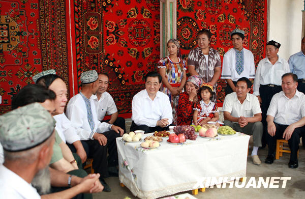 资料图:2009年8月22日至25日,中共中央总书记、国家主席、中央军委主席胡锦涛在新疆考察工作,深入天山南北看望慰问各族干部群众。这是胡锦涛在阿克苏市良种场尤喀克桥格塔勒村村民亚森・吐尼亚孜家院子里,同维吾尔族、汉族乡亲亲切交谈,勉励大家共同建设团结和谐的美好家园。