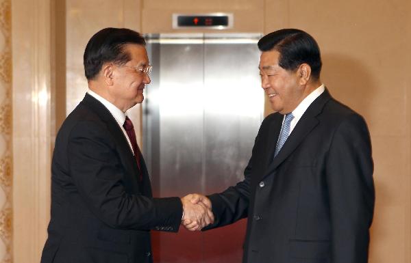 5月7日,中共中央政治局常委、全国政协主席贾庆林在北京人民大会堂会见中国国民党荣誉主席连战和夫人及随行人员。