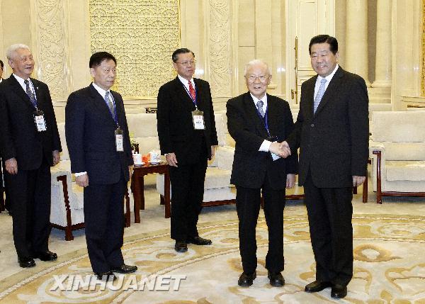 4月7日,中共中央政治局常委、全国政协主席贾庆林在北京人民大会堂会见由许历农率领的台湾新同盟会退役将领访问团一行。