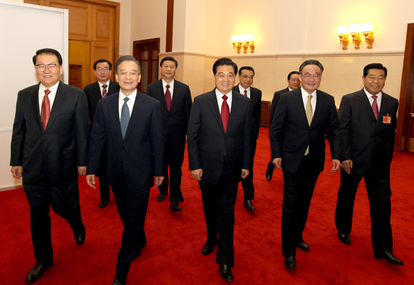 3月3日下午,中国人民政治协商会议第十一届全国委员会第三次会议在北京人民大会堂开幕。这是党和国家领导人胡锦涛、吴邦国、温家宝、贾庆林、李长春、习近平、李克强、贺国强、周永康等步入会场。