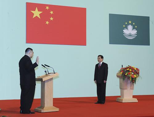 12月20日,中共中央总书记、国家主席、中央军委主席胡锦涛出席庆祝澳门回归祖国10周年大会暨澳门特别行政区第三届政府就职典礼。这是由国家主席胡锦涛监誓,在崔世安带领下,澳门特别行政区第三届政府主要官员及检察长宣誓就职。