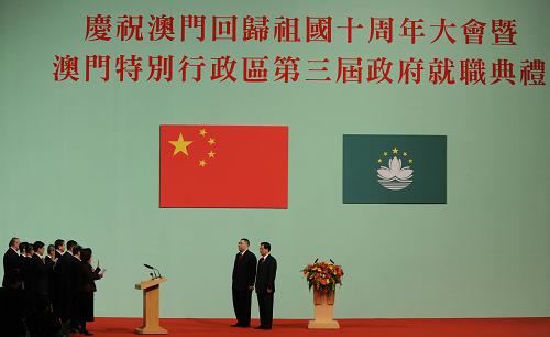 12月20日,中共中央总书记、国家主席、中央军委主席胡锦涛在庆祝澳门回归祖国10周年大会暨澳门特别行政区第三届政府就职典礼上发表重要讲话。