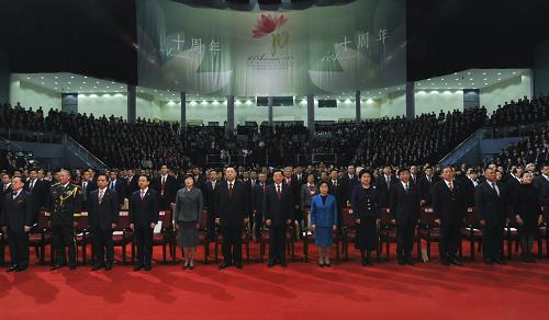 12月20日,庆祝澳门回归祖国10周年大会暨澳门特别行政区第三届政府就职典礼在澳门举行。这是全体起立,唱中华人民共和国国歌。