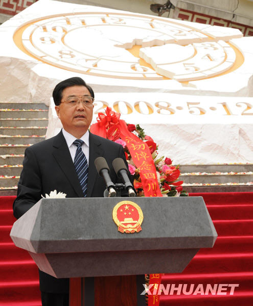 5月12日,纪念汶川特大地震一周年活动在四川省汶川县映秀镇隆重举行。中共中央总书记、国家主席、中央军委主席胡锦涛发表重要讲话。 新华网四川映秀5月12日电 青山寂静倾听深切思念,岷江奔腾激扬奋进力量。5月12日下午,当四川汶川特大地震这个举世震惊的危难时刻过去整整一年之际,纪念四川汶川特大地震一周年活动在震中汶川县映秀镇隆重举行。中共中央总书记、国家主席、中央军委主席胡锦涛出席纪念活动并发表重要讲话,向在地震灾害中不幸罹难的同胞们、向为夺取抗震救灾斗争重大胜利而英勇献身的烈士们表达深切思念,号召全党全军全国各族人民大力弘扬伟大抗震救灾精神,奋力夺取抗震救灾斗争全面胜利。 中共中央政治局常委、国务院副总理李克强出席纪念活动。 纪念活动主会场设在映秀镇漩口中学遗址。会场内苍柏环绕、素花掩映,气氛庄严肃穆。会场入口处的横幅上,黄白两色绢花映衬着“深切悼念四川汶川特大地震遇难同胞”16个黑色大字。地震中倾倒的教学楼废墟前,安放着一个硕大的四川汶川特大地震纪念表盘,时间定格在14时28分。纪念表盘西侧,矗立着一面四川汶川特大地震记事墙,墙上铭文记述了这场地震造成的巨大损失和中国人民奋起抗震救灾的英雄壮举,浮雕刻画了救援人员解救被困群众的感人场面。纪念表盘东侧危楼上,悬挂着“万众一心、众志成城,不畏艰险、百折不挠,以人为本、尊重科学”的大幅标语,表达了广大干部群众弘扬伟大抗震救灾精神的坚毅决心。 14时20分许,一支小号长鸣,吹奏起婉转低回的《思念曲》。胡锦涛等党和国家领导人步入会场,同现场300多名出席活动的各界人士一起静静肃立。 14时25分,伴随着深情的《献花曲》,20名礼兵抬起10只花篮,正步缓缓走向四川汶川特大地震纪念表盘,将花篮整齐摆放在纪念表盘前。花篮分别由中共中央,全国人大常委会,国务院,全国政协,中央军委,各民主党派中央、全国工商联和无党派人士,各人民团体,四川省,陕西省,甘肃省敬献。 胡锦涛神情庄重地走上台阶,在中共中央敬献的花篮前驻足凝视,亲手整理花篮上的缎带。 14时28分,四川汶川特大地震发生的时刻,全场肃立,向在地震中不幸遇难的同胞和在抗震救灾斗争中英勇献身的烈士默哀。 随后,举行了庄严的升国旗、唱国歌仪式。胡锦涛等党和国家领导人同大家一起,齐声高唱中华人民共和国国歌。在雄壮激昂的国歌声中,鲜艳的五星红旗冉冉升起,高高飘扬在学校地震遗址最高点塔楼顶端,彰显出英雄的中国人民敢于战胜一切困难、重建充满希望新生活的坚强意志。 纪念活动上,胡锦涛发表了重要讲话。他代表党中央、国务院和中央军委,向在抗震救灾和灾后恢复重建第一线英勇奋战的广大干部群众,人民解放军指战员、武警部队官兵、民兵预备役人员和公安民警,向大力支持抗震救灾和灾后恢复重建的全国各条战线的广大干部群众,各民主党派、工商联和无党派人士、各人民团体以及社会各界,向踊跃为灾区提供援助的香港同胞、澳门同胞、台湾同胞以及海外华侨华人,致以崇高的敬意。胡锦涛还代表中国政府和中国人民,向对中国抗震救灾和灾后恢复重建给予真诚同情和宝贵支持的有关国家领导人、政府、政党、社会团体和驻华使馆,联合国有关组织和一些国际机构、外资企业以及国际友好人士,再一次表示衷心的感谢。 胡锦涛指出,面对空前惨烈的灾难,在党中央、国务院和中央军委坚强领导下,全党全军全国各族人民众志成城、迎难而上,夺取了抗震救灾斗争重大胜利,表现出泰山压顶不弯腰的大无畏气概,谱写了感天动地的英雄凯歌。在中央大力支持、灾区广大干部群众艰苦奋斗、全国人民大力支援下,城乡居民住房重建、学校医院等公共服务设施重建、基础设施恢复重建、产业重建和结构调整、历史文化保护、生态修复等方面均取得显著成绩,灾后恢复重建取得重要阶段性成果,灾区人民正大踏步走向新生活。 胡锦涛强调,在抗震救灾和灾后恢复重建中,举国上下同心协力,海内外同胞和衷共济,充分展现了中华民族团结奋斗的民族品格和风雨同舟的强大力量。抗震救灾和灾后恢复重建取得的成绩,必将鼓舞全国各族人民满怀信心地把改革开放和社会主义现代化事业继续推向前进。 胡锦涛强调,当前,我国正处在应对国际金融危机冲击、保持经济平稳较快发展的关键时刻。在前进道路上,我们要以邓小平理论和“三个代表”重要思想为指导,深入贯彻落实科学发展观,大力弘扬伟大抗震救灾精神,全面推进社会主义经济建设、政治建设、文化建设、社会建设以及生态文明建设和党的建设,为实现党的十七大描绘的宏伟蓝图而团结奋斗。要继续扎扎实实推动经济社会又好又快发展,把保持经济平稳较快发展作为经济工作的首要任务,全力做好保增长、保民生、保稳定各项工作;继续扎扎实实推进灾后恢复重建工作,加大力度,加快速度,攻坚克难,力争用两年时间基本完成原定3年的目标任务;继续扎扎实实加强防灾减灾工作,全面提高对自然灾害的综合防范和抵御能力,加强防灾减灾领域及国际人道主义援助等方面的国际交流合作,为人类防范和抵御自然灾害作出积极贡献。 胡锦涛最后说,抗震救灾和灾后恢复重建的伟大实践再一次告诉我们,团结就是力量,拼搏才能胜利。全党全军全国各