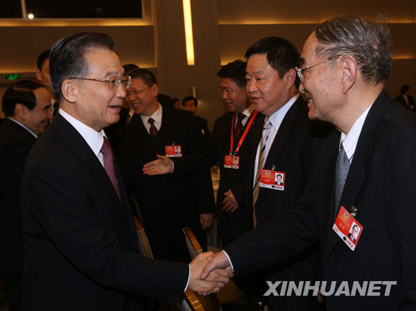 3月4日,中共中央政治局常委、国务院总理温家宝看望出席全国政协十一届二次会议经济、农业界委员并参加联组讨论。