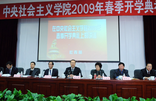 中央社会主义学院2009年春季开学典礼2日在北京举行。全国人大常委会副委员长、民进中央主席、中央社会主义学院院长严隽琪,全国政协副主席、中央统战部部长杜青林出席开学典礼并发表讲话。