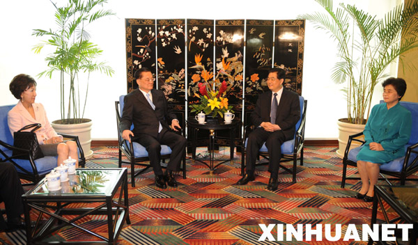 新华网利马11月21日电 中共中央总书记胡锦涛和夫人刘永清21日在利马会见了中国国民党荣誉主席连战和夫人连方�。
