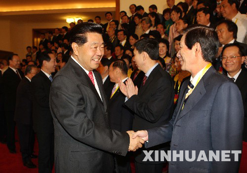 9月26日,中共中央政治局常委、全国政协主席贾庆林在北京人民大会堂会见出席中华海外联谊会三届一次理事大会的全体理事