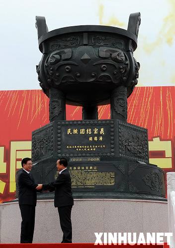9月22日下午,由胡锦涛总书记亲笔题写鼎名的“民族团结宝鼎”赠鼎仪式在宁夏博物馆宝鼎广场举行。这是中共中央政治局常委、中央纪委书记、中央代表团团长贺国强(左)和宁夏回族自治区党委书记陈建国为宝鼎揭幕后握手。