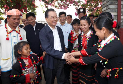 新华网昆明4月2日电 3月31日至4月1日,中共中央政治局常委、国务院总理温家宝在出席大湄公河次区域经济合作第三次领导人会议后,乘飞机从万象赶赴云南省德宏傣族景颇族自治州,先后考察走访了傣族、景颇族、德昂族三个少数民族村寨,并利用晚上的时间召开了基层少数民族群众座谈会。
