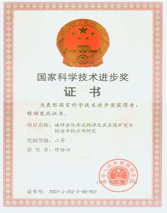 1月8日,首席科学家缪协兴教授(右二)、课题骨干浦海(右三)作为获奖者及成果单位代表出席国家科学技术奖励大会,并在人民大会堂合影 首席科学家缪协兴教授获得2007年国家科技进步二等奖。图为奖获奖证书 中国矿业大学获得2007年国家科技进步二等奖。图为获奖证书