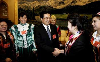 2005年3月8日,胡锦涛参加十届全国人大三次会议新疆代表团审议。
