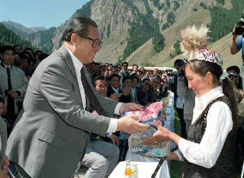 1990年8月22日至9月1日,江泽民在新疆维吾尔自治区考察工作。这是江泽民在乌鲁木齐市郊南山观看哈萨克牧民进行的赛马、姑娘追、刁羊比赛后,向赢得赛马比赛第一名的哈萨克姑娘发奖。