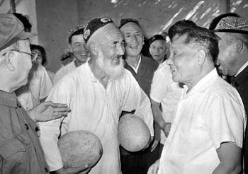 1981年8月,邓小平在新疆吐鲁番县五星公社访问了一家维吾尔族社员。离别时,维吾尔族老汉赠送给他两个哈密瓜。