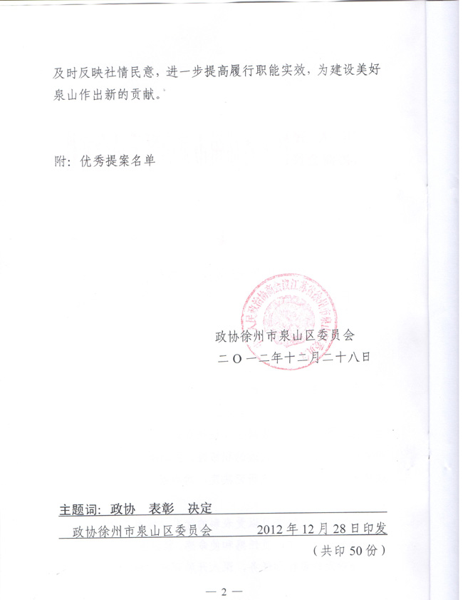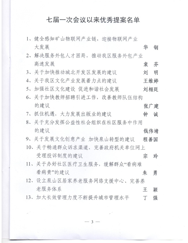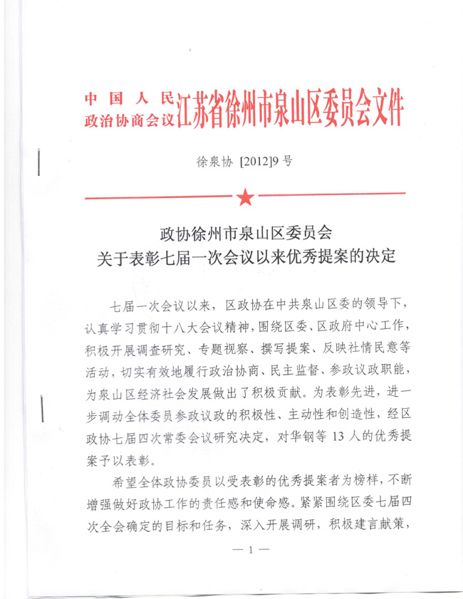 近日,徐州市泉山区政协下发了《政协徐州市泉山区委员会关于表彰七届一次会议以来优秀提案的决定》(徐泉协[2012]9号)文件。文件指出,七届一次会议以来,区政协在中共泉山区委领导下,认真学习贯彻党的十八大精神,围绕区委、区政府中心工作,积极开展调查研究、专题视察、撰写提案、反映社情民意等活动,切实有效的旅行政治协商、民主监督、参政议政职能,为泉山区经济社会发展做出了积极贡献。为表彰先进,进一步调动全体委员参政议政的积极性、主动性和创造性,经研究决定对华钢等13人的优秀提案予以表彰。