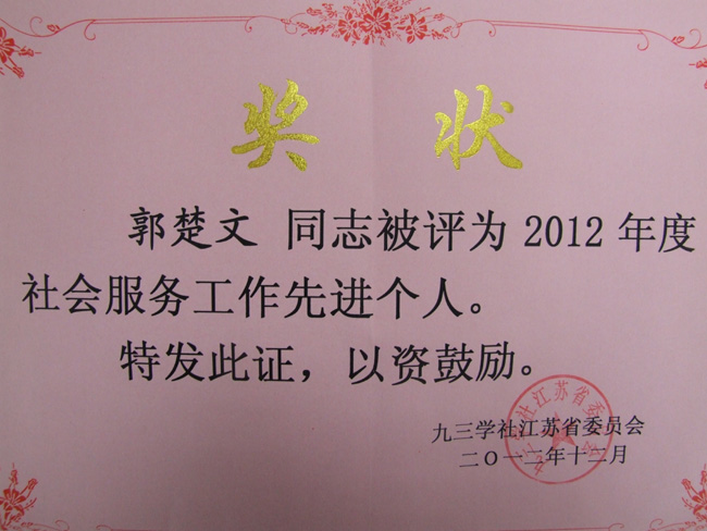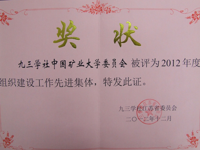 近日,九三学社江苏省委对2012年度社务工作突出、成绩显著的社员进行了表彰。在此次评比表彰活动中,九三学社矿大委员会被评为“2012年度组织建设工作先进集体”;九三学社矿大委员会主委、电力学院副院长郭楚文同志被评为“社会服务先进人”。