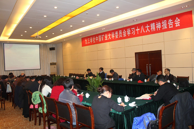 11月24日下午,九三学社中国矿业大学委员会在文昌校区学术交流中心举办了学习十八大精神专题报告会。九三学社徐州市委主委、资源与地球科学学院院长隋旺华,九三学社徐州市委驻会副主委周廷振,统战部办公室主任王虎出席了本次活动,近20名社员参加了学习。活动邀请党委统战部李来成部长做专题报告,报告会由委员会主委郭楚文主持。