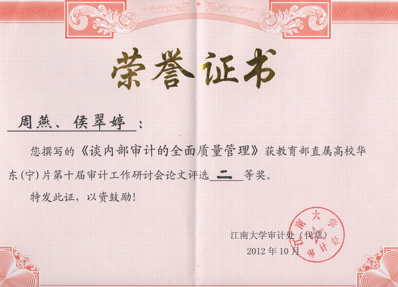 2012年10月16日�19日,教育部直属高校华东(宁)片第十届审计工作研讨会在江南大学召开。在会上,我校侨联主席、致公党支部副主委、审计处高级经济师周燕撰写的论文《谈内部审计的全面质量管理》获“教育部直属高校华东(宁)片第十届审计工作研讨会论文评选二等奖”。