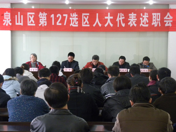 会上,泉山区泰山街道人大工委副主任祝英杰同志作了动员讲话,他强调了本次述职大会的重要意义。接着,第七届泉山区人大代表丁曙光向大会作了述职报告并详细的汇报了履职三年来的情况。我校党委统战部长李来成同志作为选民代表作了评议发言,他指出,丁曙光当选区人大代表以来,能够认真听取选民的意见和建议,积极向区人大、政协、政府等有关部门建言献策,为广大选民办善事、办好事、办实事,得到了广大选民的拥护和爱戴。经与会选民代表认真评议,本次测评共发出测评表50张,收回50张,其中满意48张,基本满意2张,不满意0张。丁曙光代表对测评结果做了表态发言,感谢广大选民对她的支持和帮助,并表示将再接再厉履行好职责,为广大选民服务。最后,泉山区人大常委会人代工委副主任郭峰同志做了总结讲话,他充分肯定了丁曙光代表三年来履职取得的成绩,并对今后更好的服务广大选民提出了希望和要求。