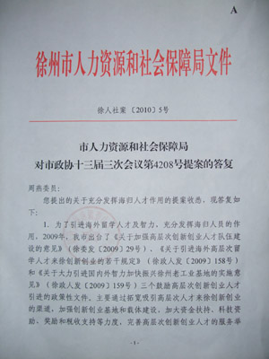 在今年徐州市政协十三届委员会第三次会议上,市政协侨台界委员、我校侨联副主席周燕提出了《关于充分发挥徐州市海归人才作用的建议》的提案,市政协将其列为第4208号提案,并转交市科技局及人力资源社会保障局办理,市科技局及人力资源社会保障局负责人高度重视,认真研究,还分别派出专人来我校与市政协委员周燕进行了面对面的洽谈与沟通。市科技局于7月5日就提案中所涉及的有关问题提出了三条书面答复意见;市人力资源社会保障局于7月13日以红头文件(徐人社案[2010]5号)也提出了三条书面答复意见。