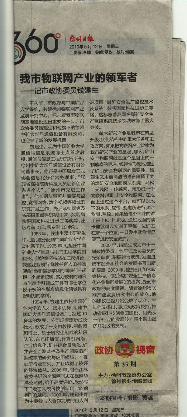 编者按:2010年5月12日,《徐州日报》政协视窗专栏以《我市物联网产业的领军者》为题介绍了我校市政协委员钱建生教授在市物联网产业发展方面所做的贡献。现予以转载,以飨读者。