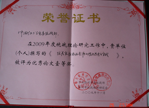 本次会议还对2009年度的统战理论研究成果进行了评比表彰,共评出一等奖4项,二等奖6项,三等奖13项。我校党委统战部撰写的《统筹高校政治资源的理论思考与实践》获一等奖。