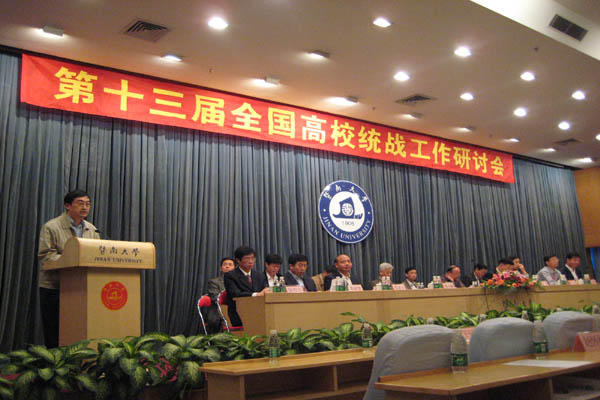 会议还就如何贯彻落实党的十七大精神,深入学习实践科学发展观进行了深入的探讨,与会代表认为:高校是我国统一战线重要的工作基地、人才基地、信息基地、统战理论研究基地和海外统战工作的重要桥梁,在团结凝聚各方力量建设和谐社会方面做出了重要贡献。各级教育行政部门和高校党委对统战工作高度重视,高校统战部门围绕中心、服务大局,认真履行“反映情况、掌握政策、协调关系、举荐人才”的职责,广大高校统战工作者及有关专家,积极开展高校统战工作理论研究,在实践中不断深化对统战工作的认识,在研究中不断加深对统战工作的理解,在工作中不断总结统战工作的规律,通过理论创新有力地推动了高校统战工作的创新。与会代表一致认为:每年召开一次全国高校统战工作研讨会有利于各个高校统战工作理论研究、统战工作交流的深入开展,有利于开创全国高校统战工作的新局面。会议再次建议,由国家教育部牵头,筹备成立全国高校统战工作理论与实践研讨会,以使研讨会朝着更健康、更有序、更有作为的方向发展,与会代表对暨南大学主动承办本届研讨会,并努力做好各项会务工作给予了充分地肯定和高度评价。