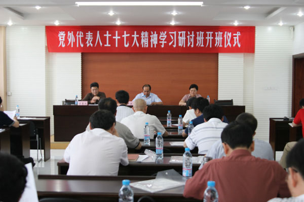 为了深入开展我校党外代表人士对党的十七大精神的学习,按照中共中央《在统一战线中认真学习贯彻党的十七大精神通知》和中共中央《关于在无党派人士中开展以“自觉接受中国共产党的领导,坚持走中国特色社会主义道路”为主题的政治交接教育活动的意见》(统发[2007]22号文件)的要求,我校党委统战部、社会主义学院联合举办了这次党外代表人士党的十七大精神学习研讨班,这也是我校举办的有史以来第一次党外代表人士学习研讨班。
