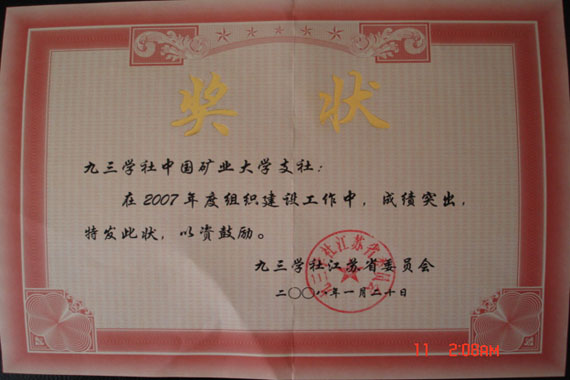 会议还对2007年度全省社在组织工作、提案信息工作、宣传工作和社会服务工作中涌现出的先进集体和先进个人进行了表彰。我校九三支社获“2007年度组织建设工作先进集体”称号。