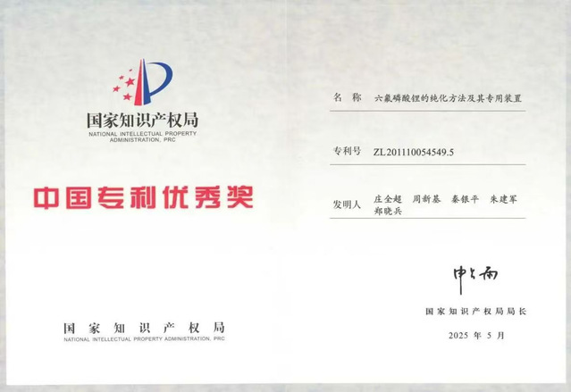 民进矿大委员会副主委庄全超教授带领的储能与动力电池团队与江苏九九久科技股份有限公司(江苏省南通市如东县)合作完成的核心专利——“六氟磷酸锂的纯化方法及其专用装置”(专利号:ZL201110054549.5),凭借突出的技术创新性、市场应用价值与行业引领作用,荣获 “中国专利优秀奖”。