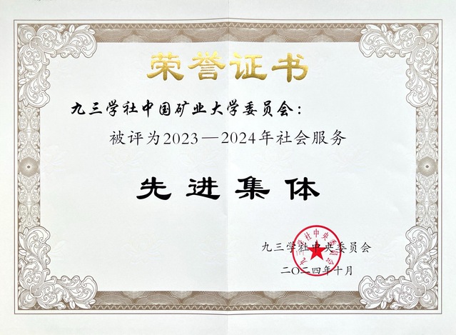 近日,九三学社中央发布了《关于表彰2023—2024年社会服务先进集体和先进个人的决定》,九三学社矿大委员会被评为“2023—2024 年社会服务先进集体”。