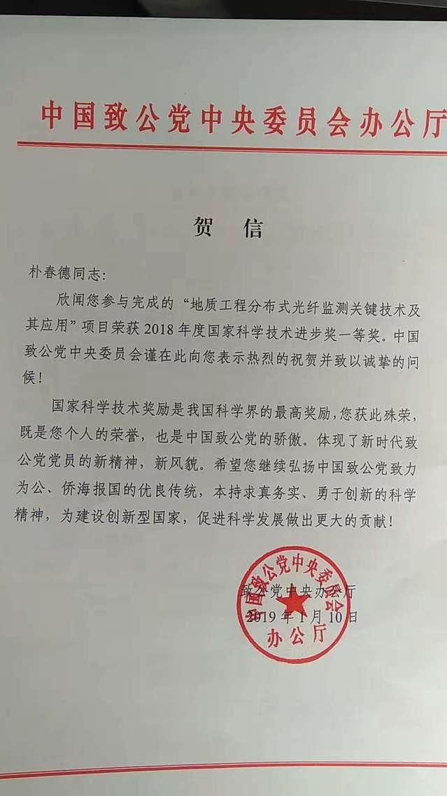 近日,致公党中央发来贺信,祝贺我校致公党支部委员、资源学院副教授朴春德获得2018年度国家科技进步一等奖,贺信如下: