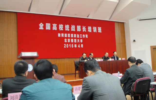 4月12-14日,全国高校统战部长培训班在北京师范大学举行。来自全国部、省属高校120多人参加了培训。教育部思政司司长冯刚、中共中央统战部六局局长王永庆、教育部思政司副司长王光彦、北京师范大学党委副书记刘利出席了开班仪式。冯刚司长做了开班动员报告,并布置了全年高校统战工作。我校统战部长李来成参加了培训。