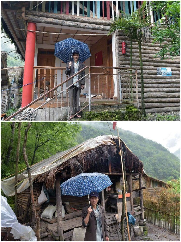 拼版照片:上图为独龙江乡巴坡村的普学清站在新建的安居房台阶上;下图为普学清站在以前居住的茅草屋前(2017年5月25日摄)
